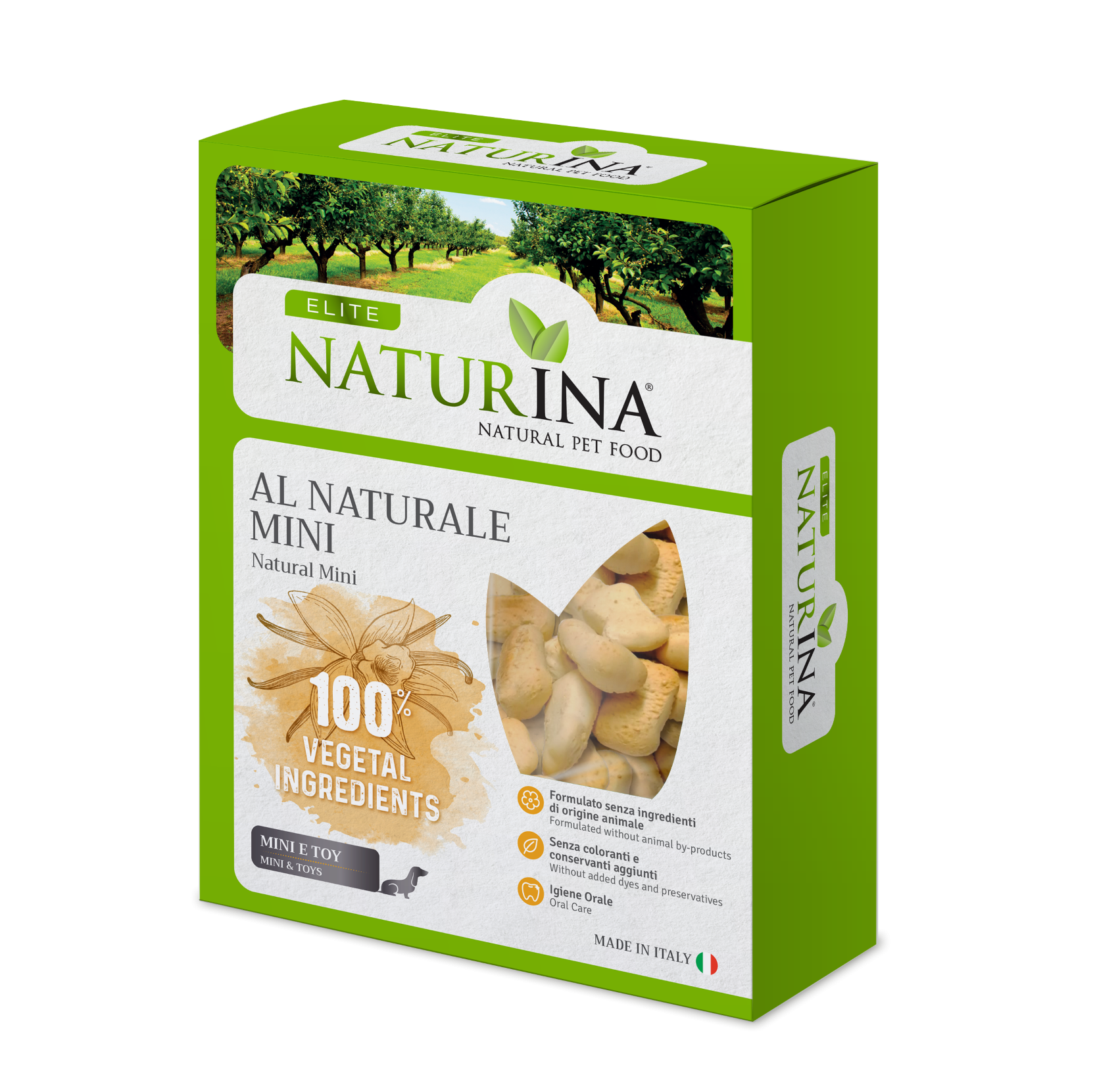 Sušenky NATURINA AL NATURALE MINI jsou velmi chutné a stravitelné, protože jsou vyráběny výhradně z kvalitních přírodních ingrediencí a představují lahodnou denní odměnu pro vašeho čtyřnohého přítele. Kostní sušenka NATURINA AL NATURALE MINI je vhodná pro malé psy. Díky výhradnímu použití rostlinných složek bez produktů živočišného původu je obzvláště vhodný pro psy s formami potravinové přecitlivělosti na maso, ryby nebo živočišné tuky. Řemeslná výroba prováděná technickým procesem zvaným "kreslení" dává výrobku zvláštní strukturu a drsnost, která při každodenním použití pomáhá udržovat ústní hygienu, snižuje tvorbu zubního kamene a bojuje proti halitóze. Příspěvek doplňkové vlákniny ve srovnání s tradičním jídlem činí sušenku NATURINA adjuvans trávení zlepšením průchodu gastrointestinálního traktu.