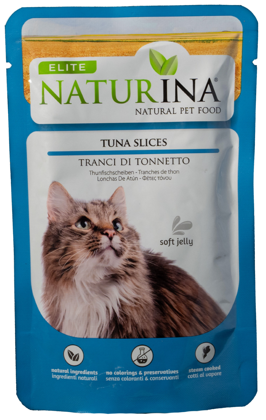 NATURINA ELITE TUNA SLICES is a complementary food for adult cats in soft jelly: steam cooked and preserved in soft jelly. Made with the best parts of tuna. Without added additives, colorings and preservatives.