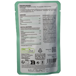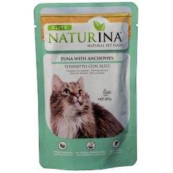 NATURINA ELITE TUNA WITH ANCHOVIES is a complementary food for adult cats in soft jelly: steam cooked and preserved in soft jelly. Made with the best parts of tuna and anchovies. Without added additives, colorings and preservatives.