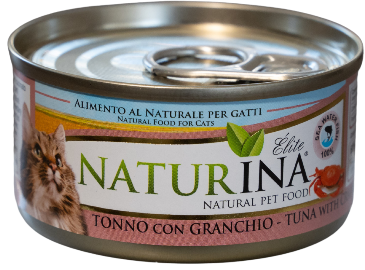 El ATÚN ELITE de NATURINA con CANGREJO es un alimento complementario para gatos adultos al natural: al vapor y almacenado en agua de cocción (sin jalea). Elaborado con finas partes de atún y cangrejo.