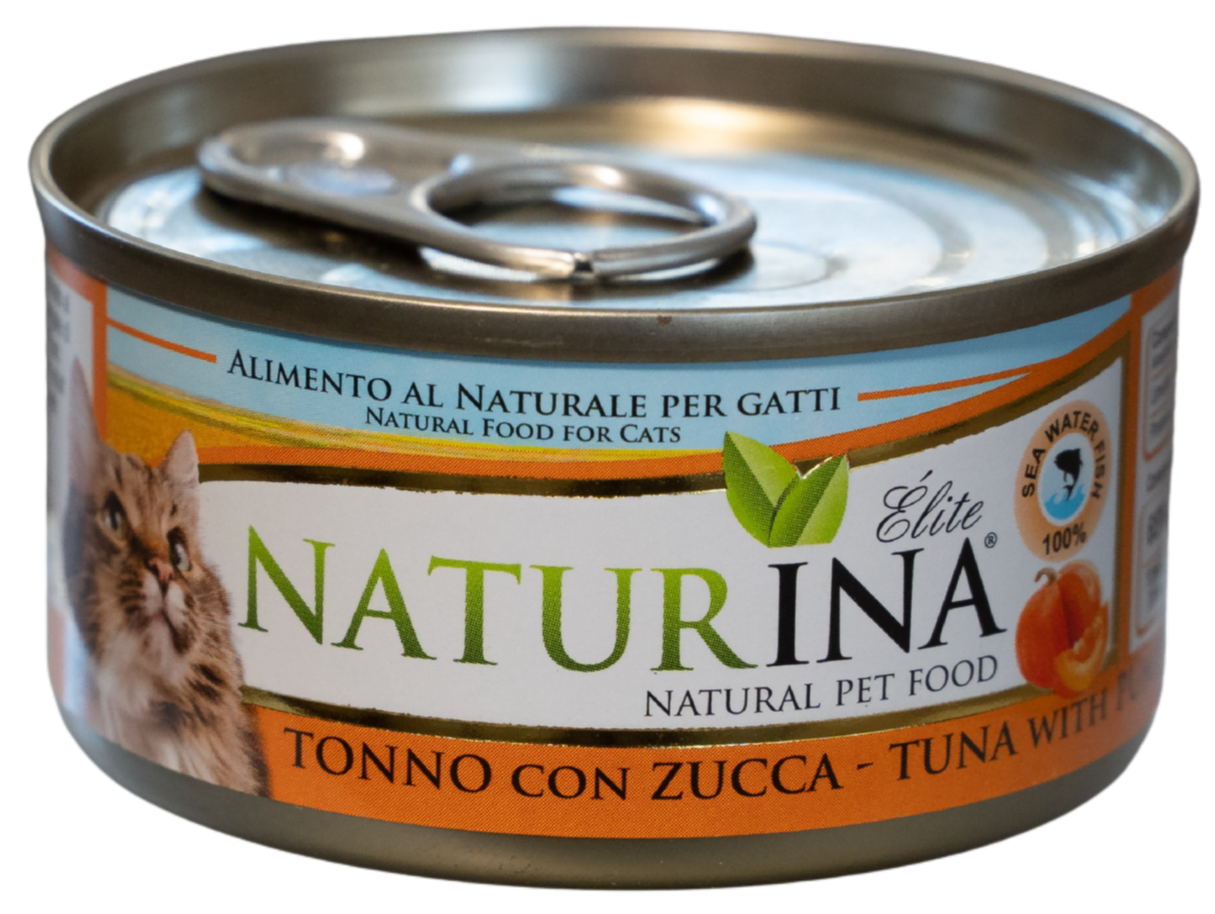 NATURINA ELITE TUNA con CALABAZA es un alimento complementario para gatos adultos al natural: cocer al vapor y almacenado en agua de cocción (sin jalea). Elaborado con finas partes de atún y calabaza.