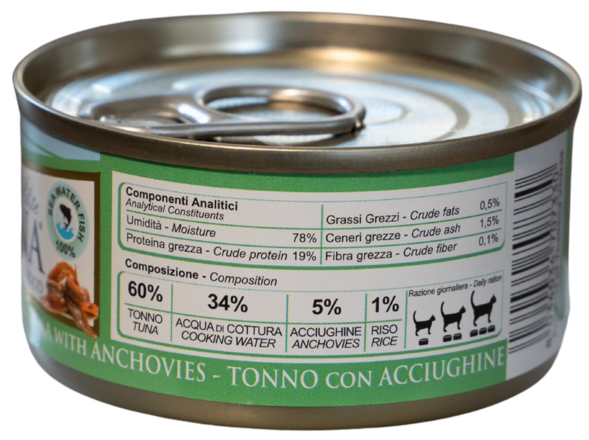NATURINA ELITE TONNO avec ACCIUGHINE est un aliment complémentaire pour chats adultes au naturel: cuit à la vapeur et conservé dans de l’eau de cuisson (pas de gélatine). Fabriqué avec des parties précieuses de thon et d’anchois.