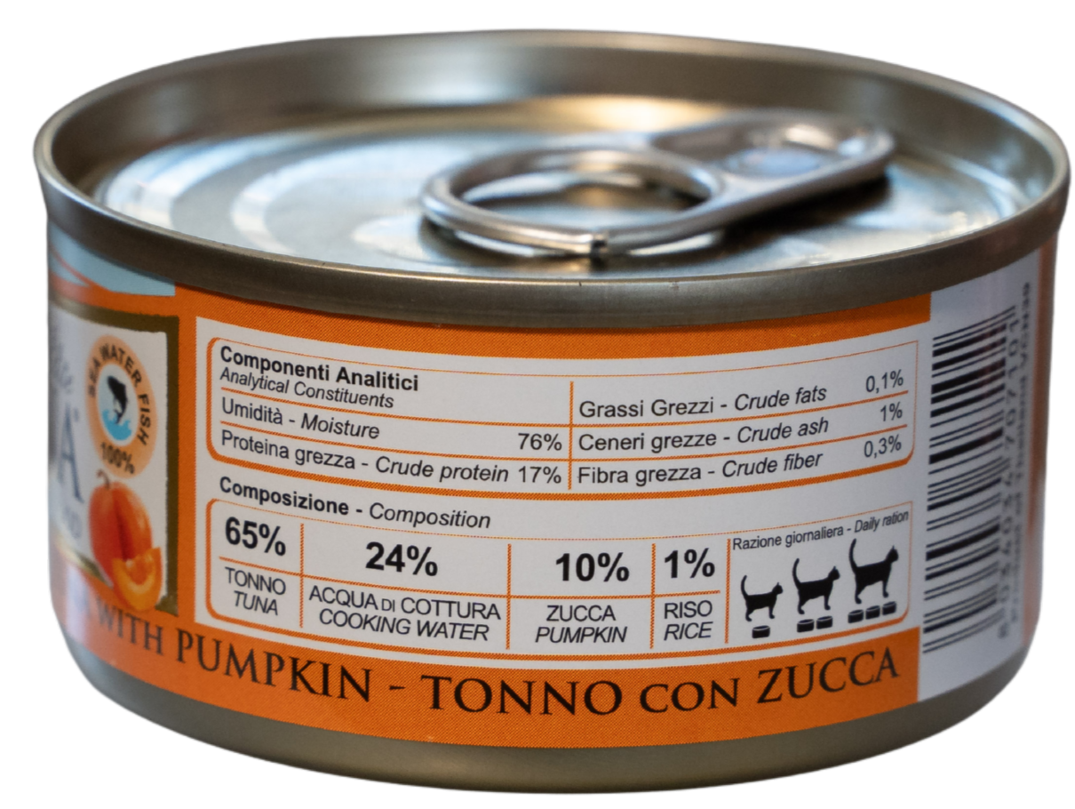 NATURINA ELITE TONNO avec ZUCCA est un aliment complémentaire pour chats adultes au naturel: cuit à la vapeur et conservé dans de l’eau de cuisson (pas de gélatine). Fabriqué avec des parties précieuses de thon et de citrouille.