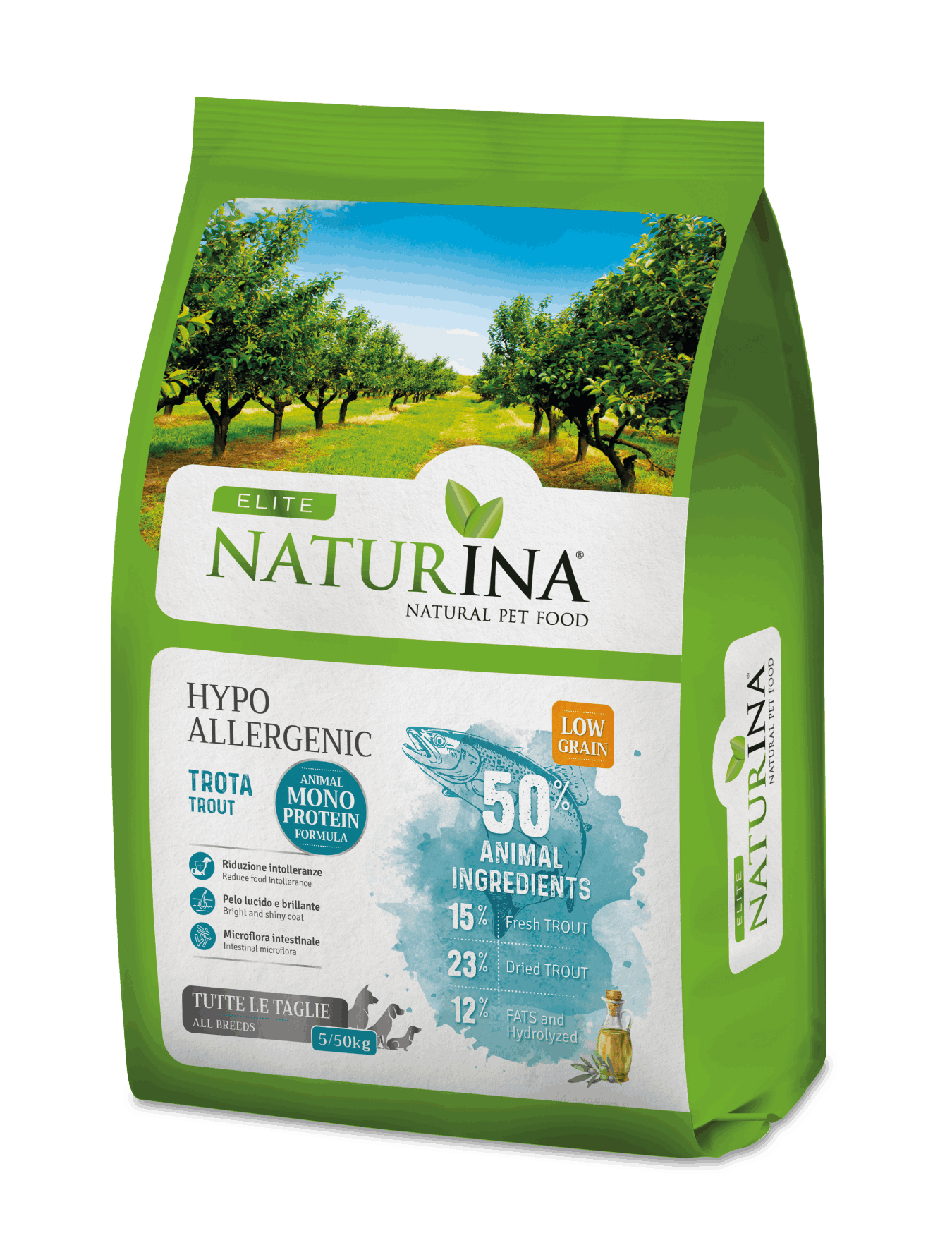 trota (38% di cui trota fresca 15%) riso integrale (20%), amido di piselli, patate, grasso di pollo (10%), proteine di piselli, proteine idrolizzate di pesce (2%), polpa di barbabietola, sostanze minerali, lievito di birra (1% fonte di MOS), mela (0,75%), olio d'oliva (0,5%), radice di cicoria (0,5% fonte di FOS), Yucca schidigera (0,3%), lignocellulosa, glucosamina (0,125%), solfato di condroitina (0,075%).
