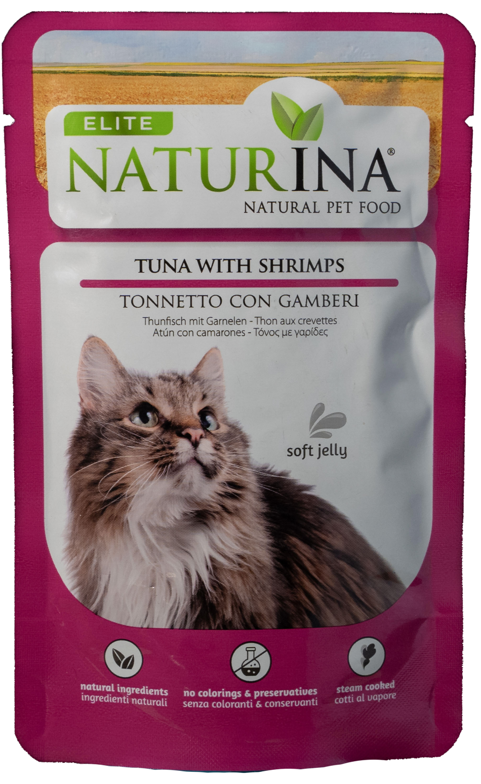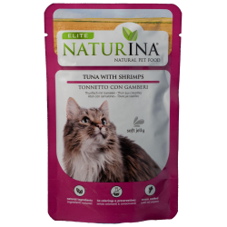 NATURINA ELITE TONNO con GAMBERI è un alimento complementare per gatti adulti in Soft Jelly: cucinato al vapore e conservato in morbida gelatina. Realizzato con parti pregiate di tonno e gamberi. Senza additivi, coloranti e conservanti aggiunti.
