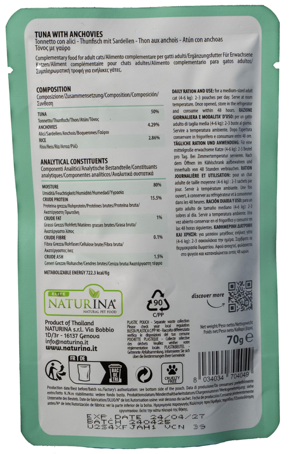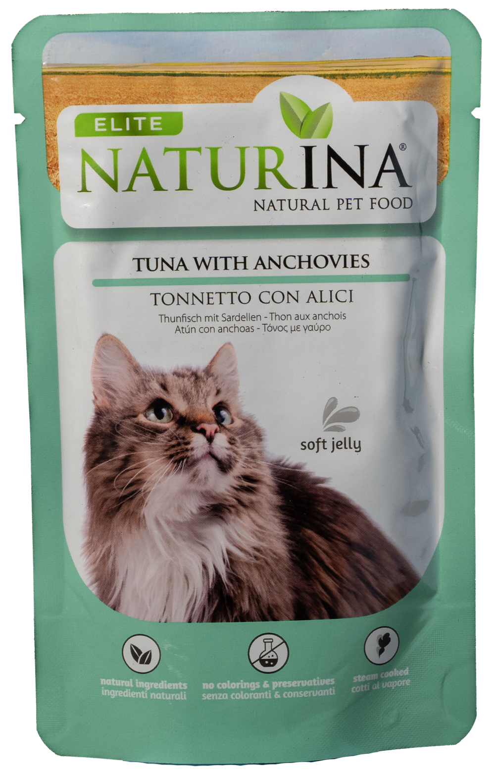 NATURINA ELITE TONNO con ALICI è un alimento complementare per gatti adulti in Soft Jelly: cucinato al vapore e conservato in morbida gelatina. Realizzato con parti pregiate di tonno e alici. Senza additivi, coloranti e conservanti aggiunti.