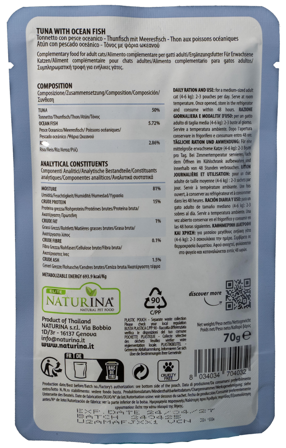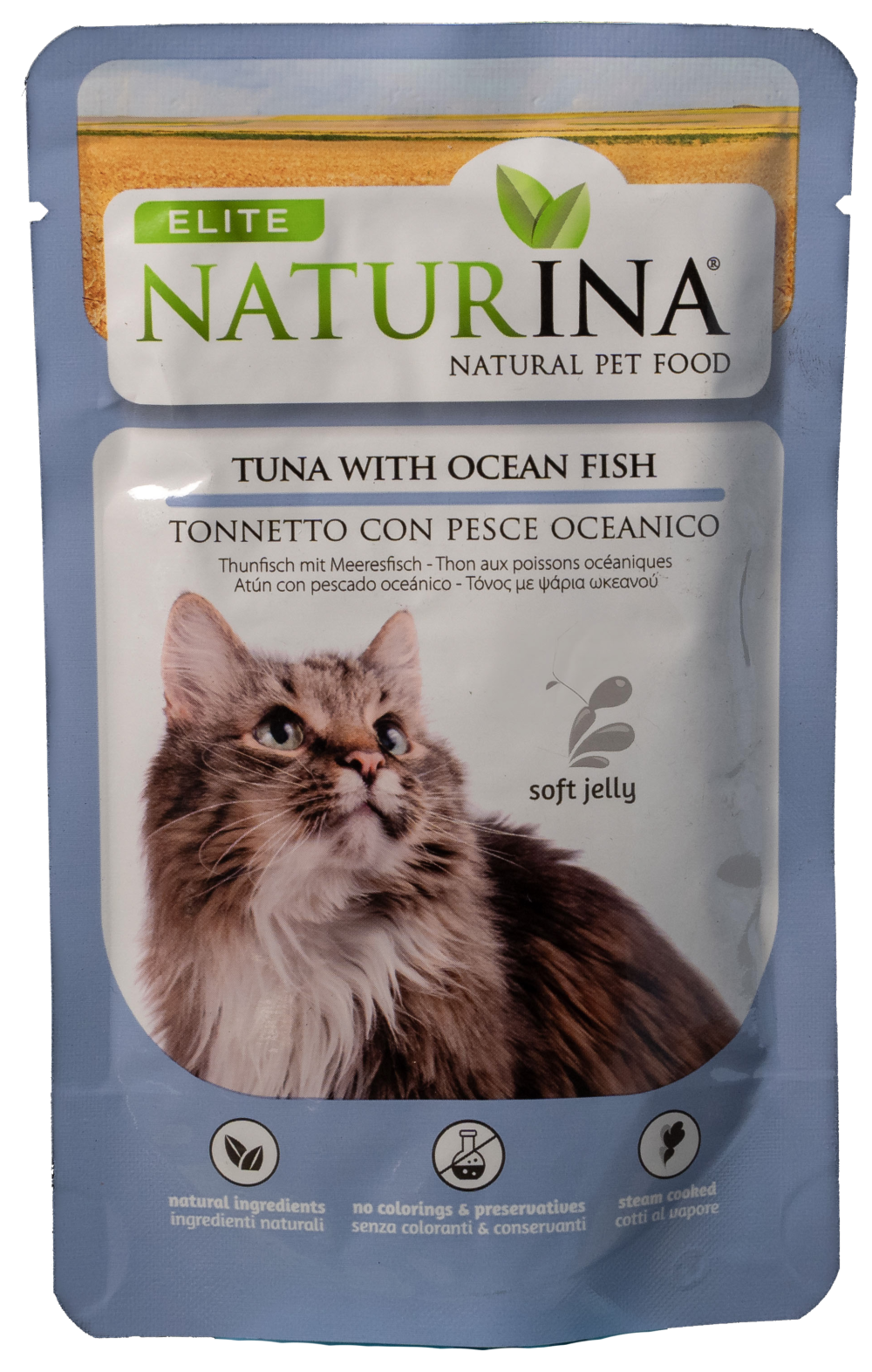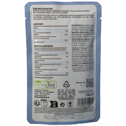 NATURINA ELITE TONNO con PESCE OCEANICO è un alimento complementare per gatti adulti in Soft Jelly: cucinato al vapore e conservato in morbida gelatina. Realizzato con parti pregiate di tonno e pesce oceanico. Senza additivi, coloranti e conservanti aggiunti.