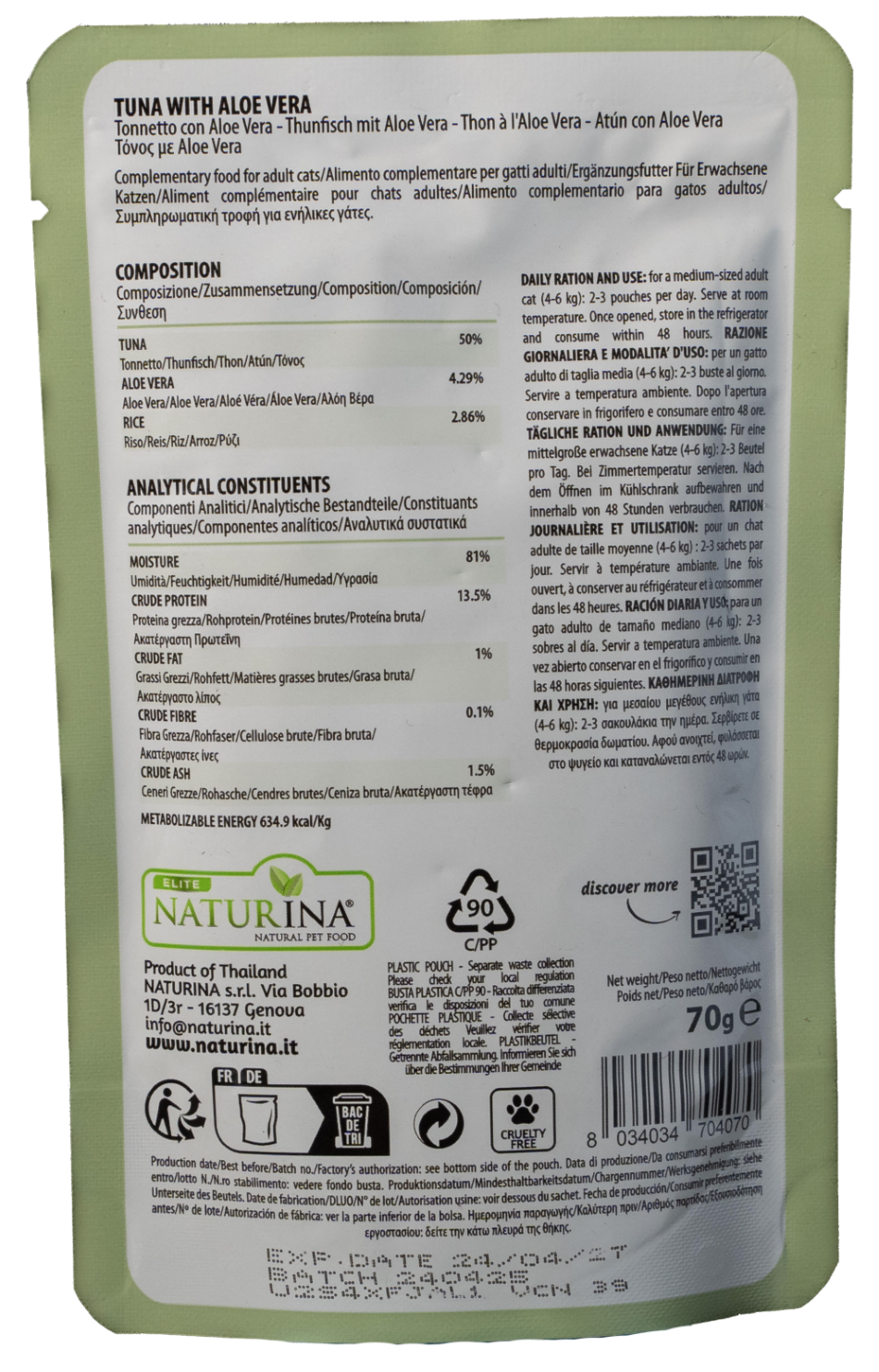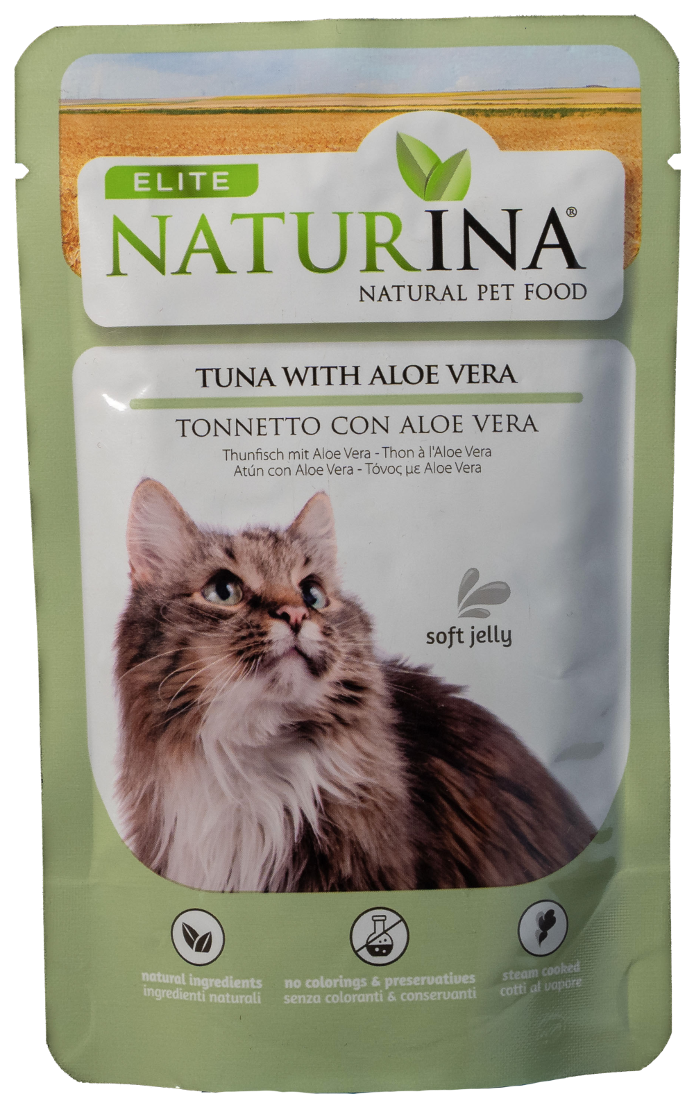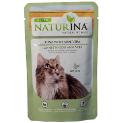NATURINA ELITE TONNO con ALOE VERA è un alimento complementare per gatti adulti in Soft Jelly: cucinato al vapore e conservato in morbida gelatina. Realizzato con parti pregiate di tonno e Aloe vera. Senza additivi, coloranti e conservanti aggiunti.