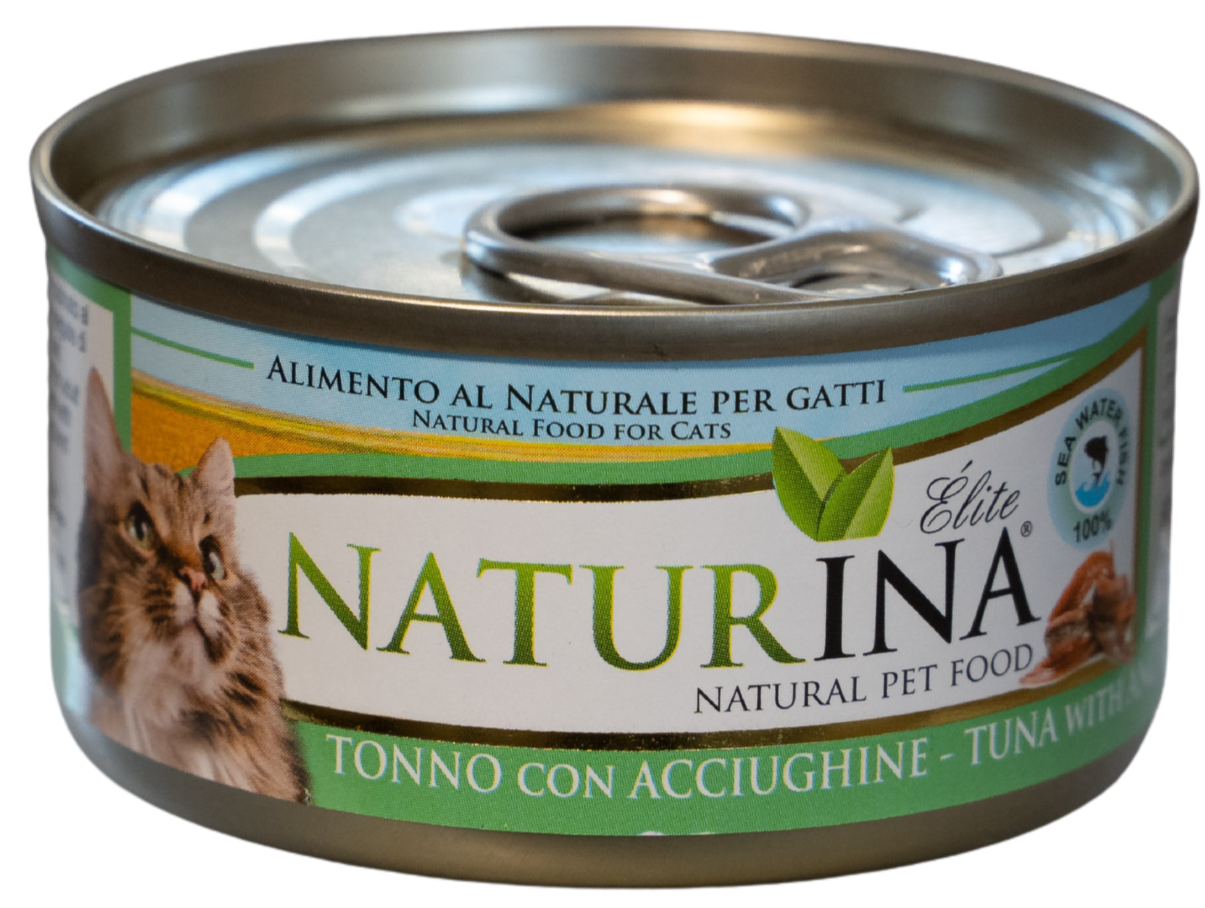 NATURINA ELITE TONNO con ACCIUGHINE è un alimento complementare per gatti adulti al naturale: cucinato al vapore e conservato in acqua di cottura (no gelatina). Realizzato con parti pregiate di tonno e acciughine.
