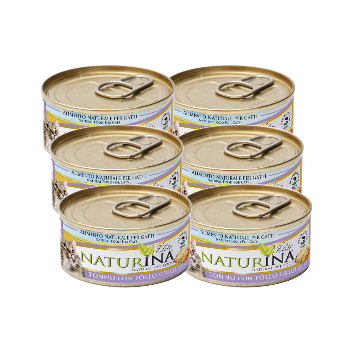 NATURINA ELITE TONNO con POLLO GRIGLIATO è un alimento complementare per gatti adulti 100% NATURALE, realizzato con parti pregiate di tonno pescato in mare e pollo d'allevamento.