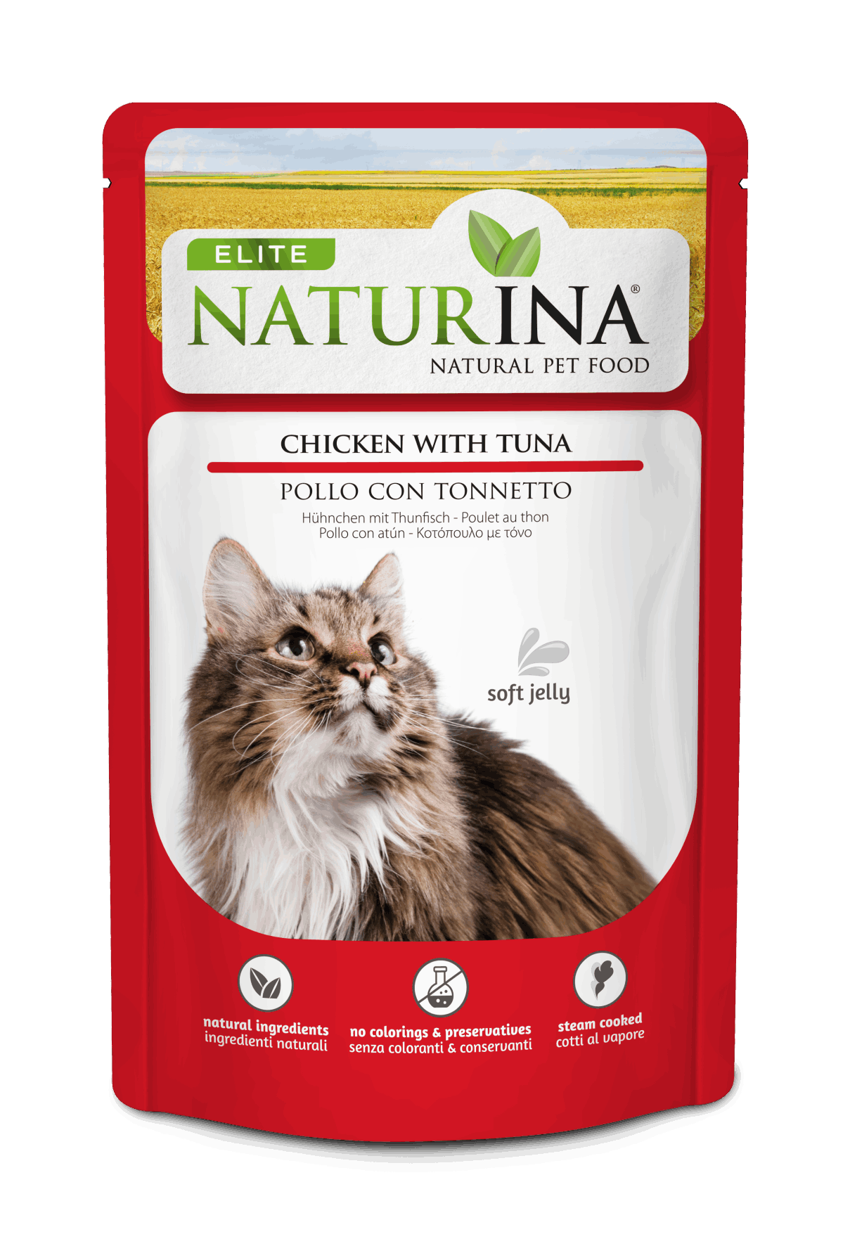 NATURINA ELITE POLLO CON TONNO in bustina è un alimento complementare per gatti adulti di tutte le taglie.