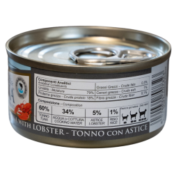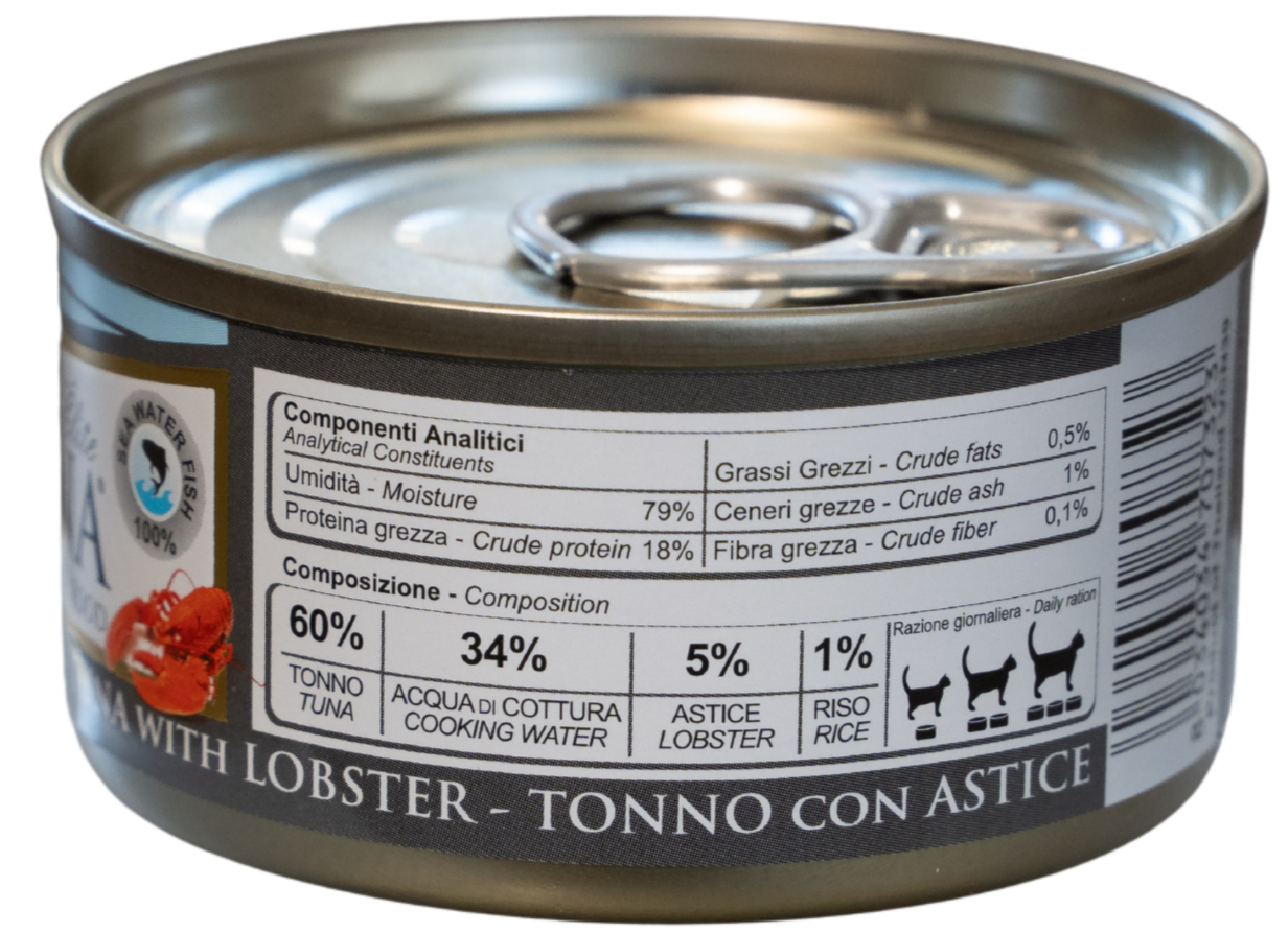 TUŃCZYK NATURINA ELITE z homarem jest pokarmem uzupełniającym dla dorosłych kotów do naturalnego: gotowanego na parze i przechowywanego w wodzie do gotowania (bez galaretki). Wykonane z drobnych części tuńczyka i homara.