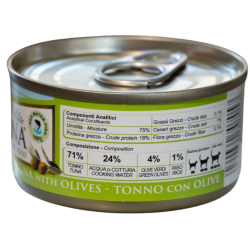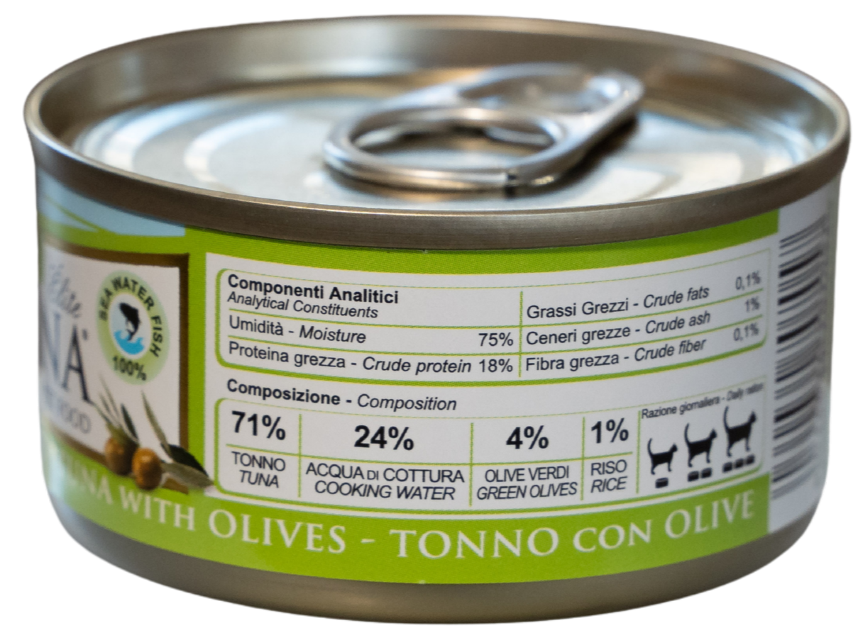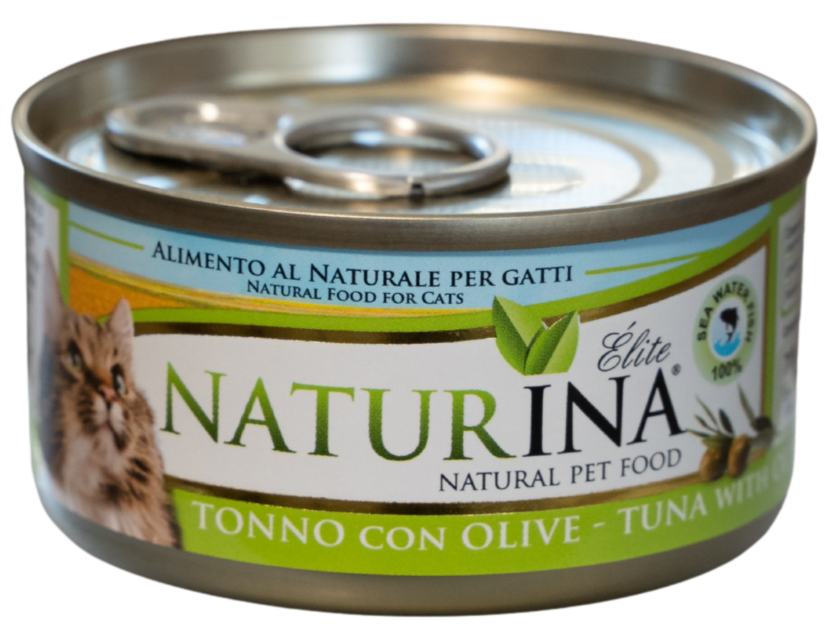 TUŃCZYK NATURINA ELITE z OLIWKAMI jest pokarmem uzupełniającym dla dorosłych kotów naturalnym: gotowanym na parze i przechowywanym w wodzie do gotowania (bez żelatyny). Wykonane z drobnych części tuńczyka i zielonych oliwek.