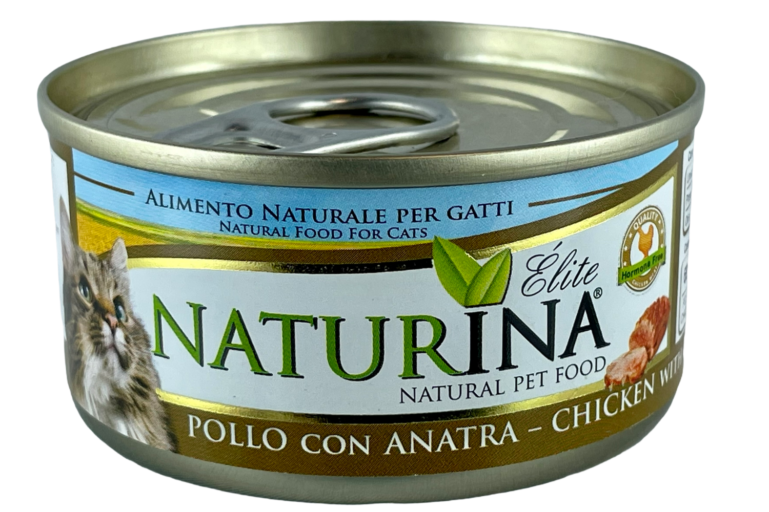 NATURINA ELITE CHICKEN with DUCK to uzupełniająca żywność dla dorosłych kotów do naturalnego: gotowanego na parze i przechowywanego w wodzie do gotowania (bez galaretki). Wykonane z filetów z piersi kurczaka i kaczki.